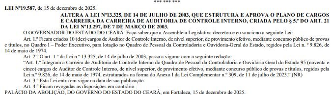 Encerra no dia 31 de dezembro de 2025 a validade do último concurso realizado pela Controladoria e Ouvidoria-Geral do Ceará (CGE CE).